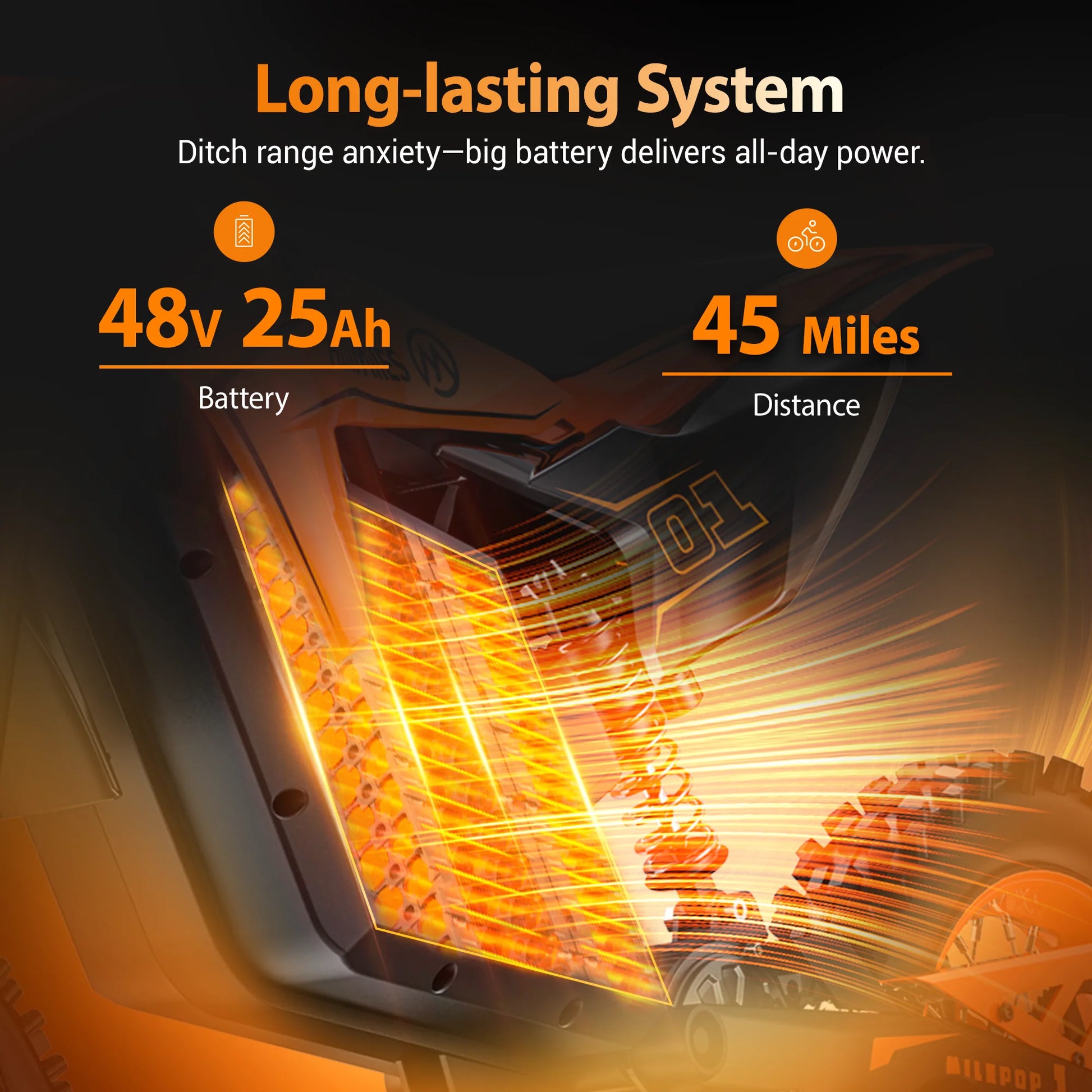- Powered by a 2000W motor and a 48V 20Ah removable battery, it delivers punchy acceleration and up to 60 km of range, with top speeds between 30 and 50 km/h on mixed terrain.