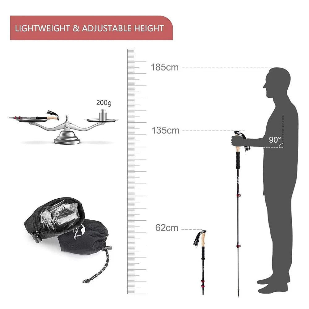 - Naturehike carbon fiber shaft uses a 3-section design with three joints, extending to 135 cm for your height and collapsing for compact packing.